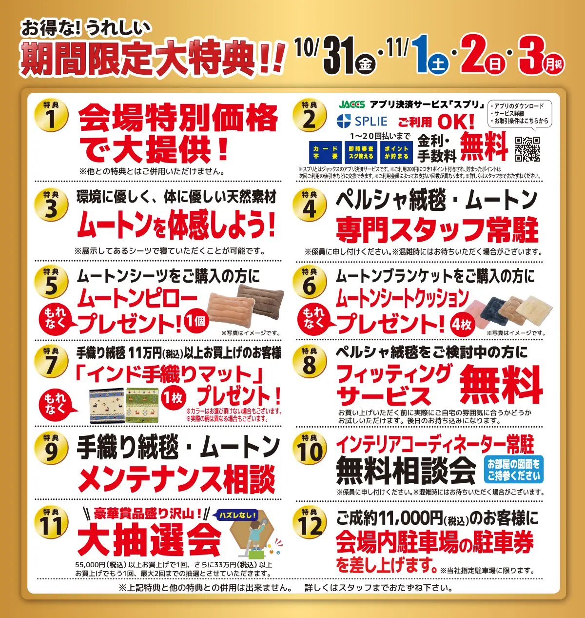 ペルシャ絨毯シルクロードフェア in 吹上ホールでは、期間限定の特典を多数ご用意しております。