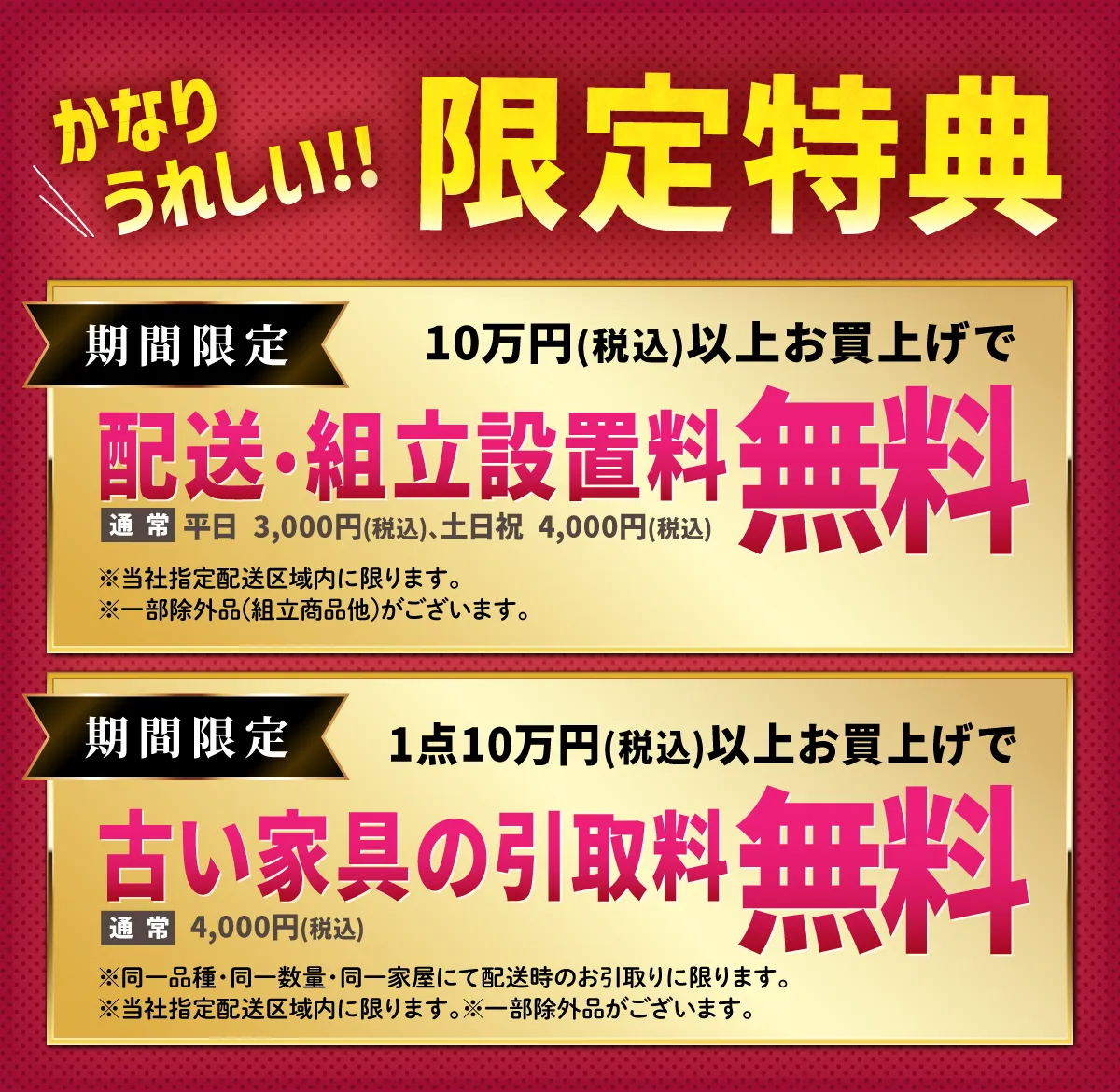 • 1点10万円(税込)以上お買上げで 古い家具の引取料 無料(※同一品種・同一数量・同一家屋にて配送時のお引取りに限ります。※当社指定配送区域内に限ります。※一部除外品がございます。)