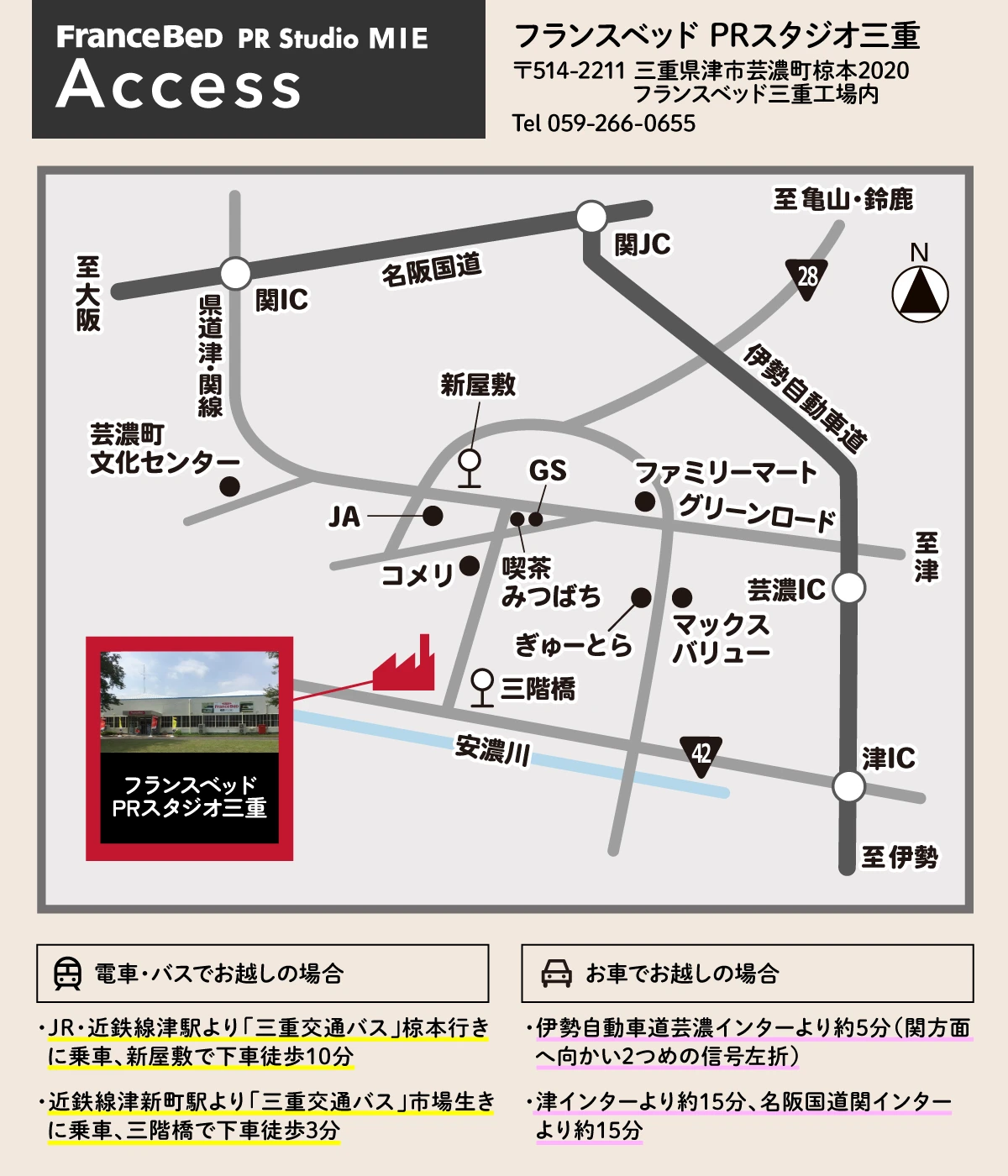 JR・近鉄線津駅より「三重交通バス」椋本行きに乗車、新屋敷で下車徒歩10分