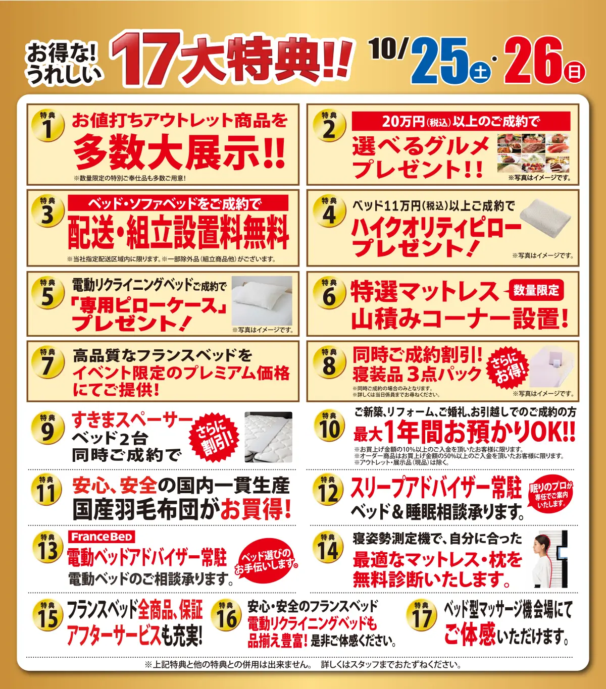フランスベッド PRスタジオ三重「秋のプレミアム大商談会」では、期間限定の特典を多数ご用意しております。