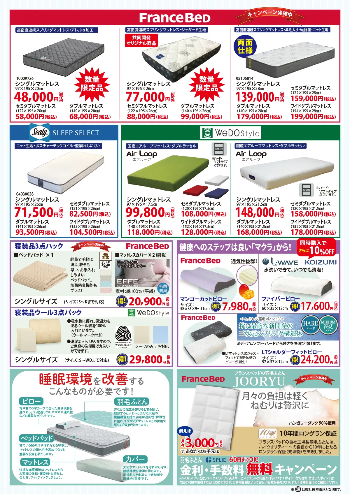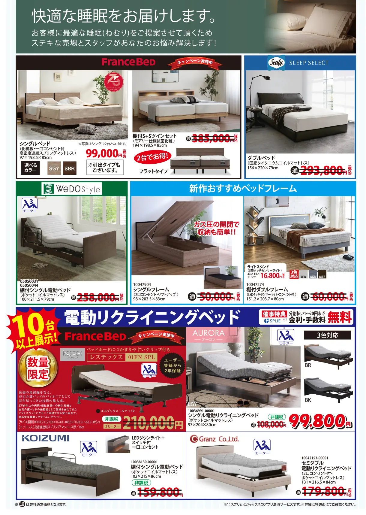 フランスベッド、ウィドゥ・スタイル、シーリー、東京ベッド(江南店のみお取り扱いがございません)等、多彩なラインナップです。