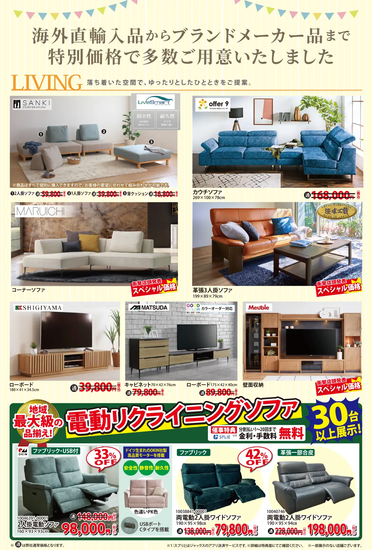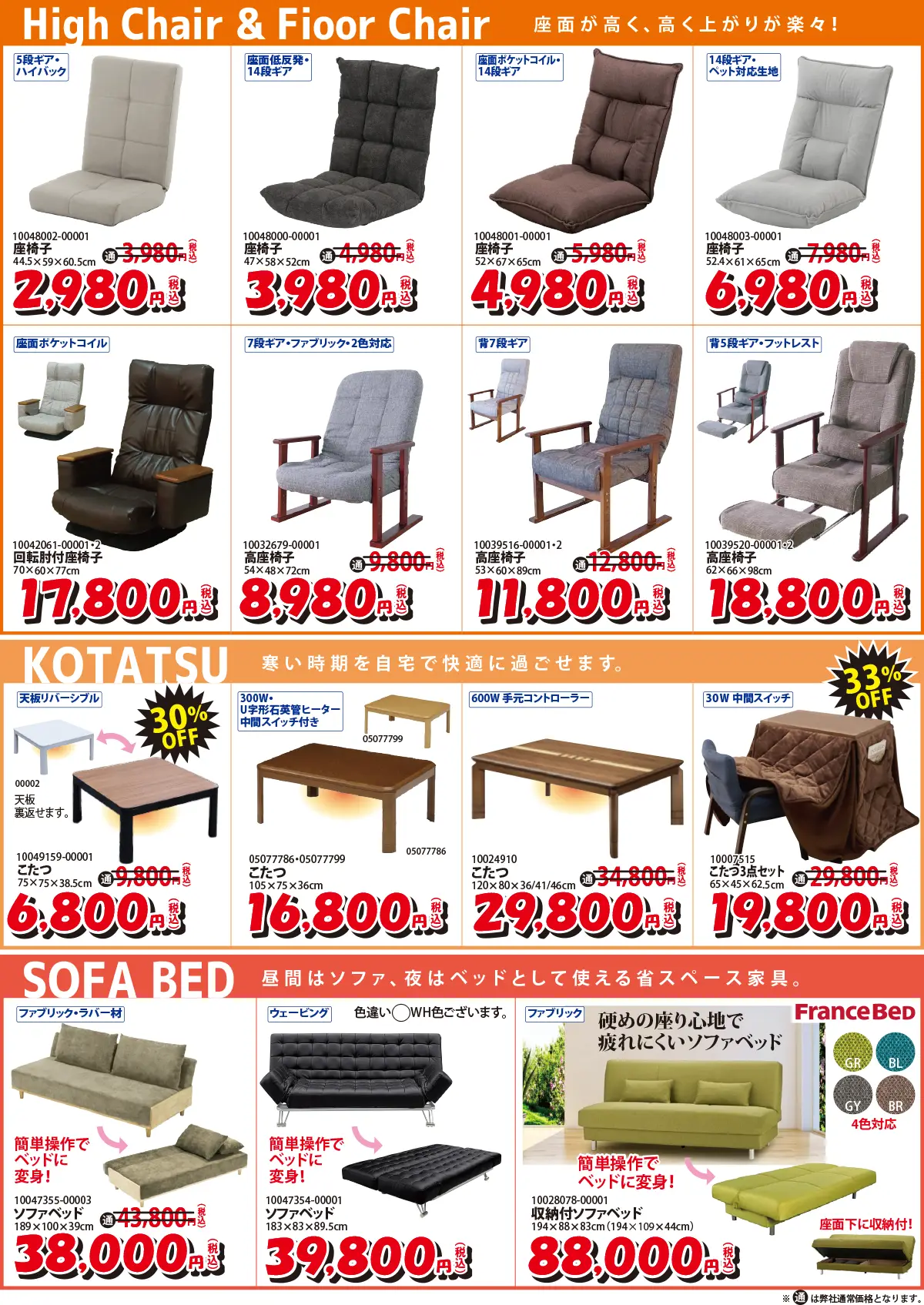 座椅子・高座椅子・こたつ・ソファベッドとお値打ち品を多数ご用意しております!
