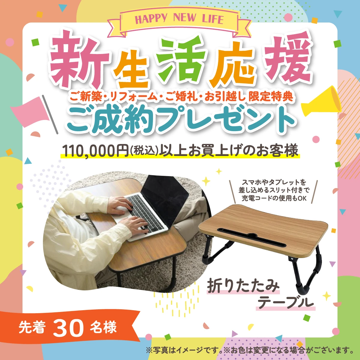【特典6】ご新築・リフォーム・ご婚礼・お引越しのお客様限定 新生活応援ご成約プレゼント 110,000円(税込)以上お買上げで素敵なインテリア小物をプレゼント!![折りたたみテーブル 先着30名様]