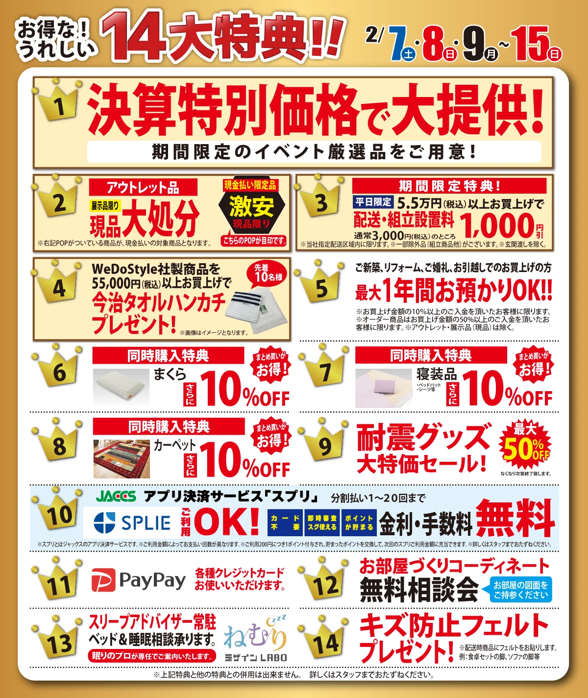 【特典5】ご新築・リフォーム・ご婚礼・お引越し 最大1年間お預かりOK!(※お買上げ金額の10%以上のご入金の方に限ります。オーダー商品は50%以上。※アウトレット品・展示品(現品)は対象外となります。)