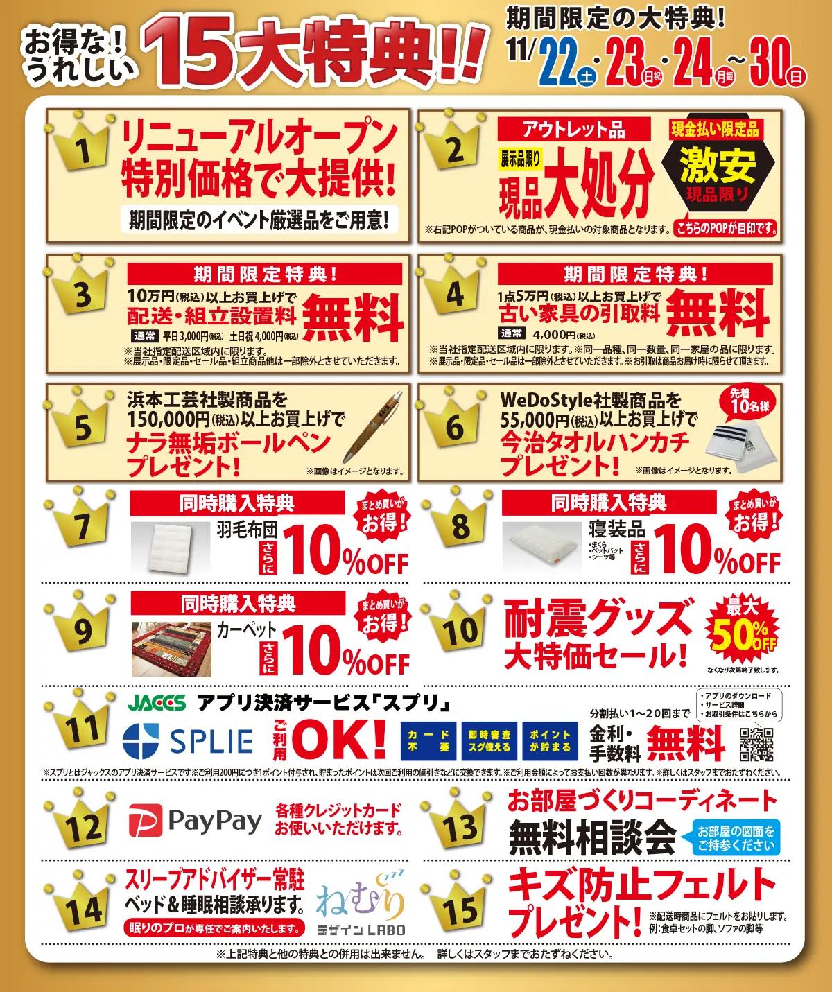 《浜本工芸×ウィドゥ・スタイル》リニューアルオープン記念セール in 大和郡山店 では、期間限定の特典を多数ご用意しております。