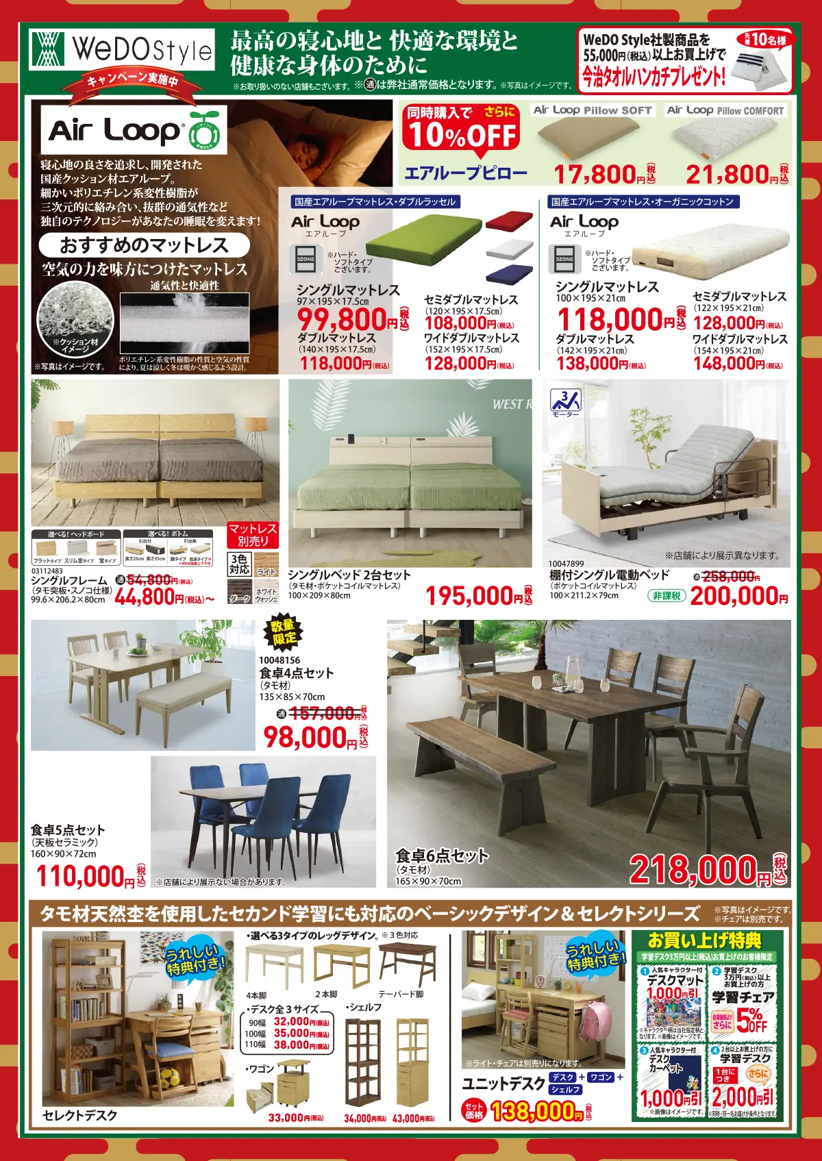 Air Loop(エアループ)マットレスや畳ベッドフレーム、ダイニングセットをイベントお値打ち価格にてご用意しております。