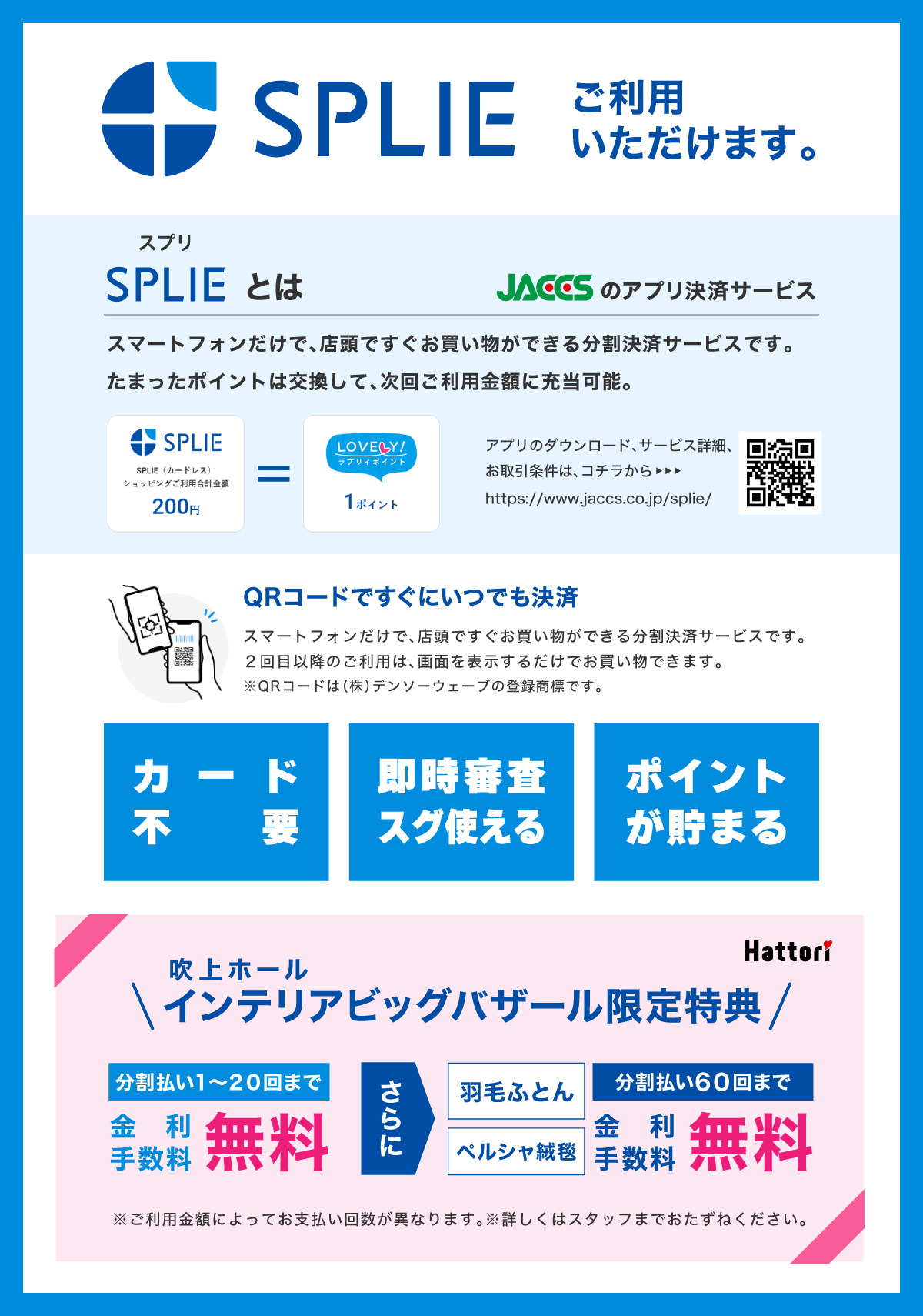 【特典15】[SPLIE(スプリ)]ご利用OK!分割払い1〜20回まで金利手数料無料!(※SPLIE(スプリ)とはジャックスのアプリ決済サービスの名称です。※ご利用200円につき1ポイント付与され、貯まったポイントは交換して次回ご利用金額に充当できます。※ご利用金額によってお支払い回数が異なります。※詳しくはスタッフまでおたずねください。)