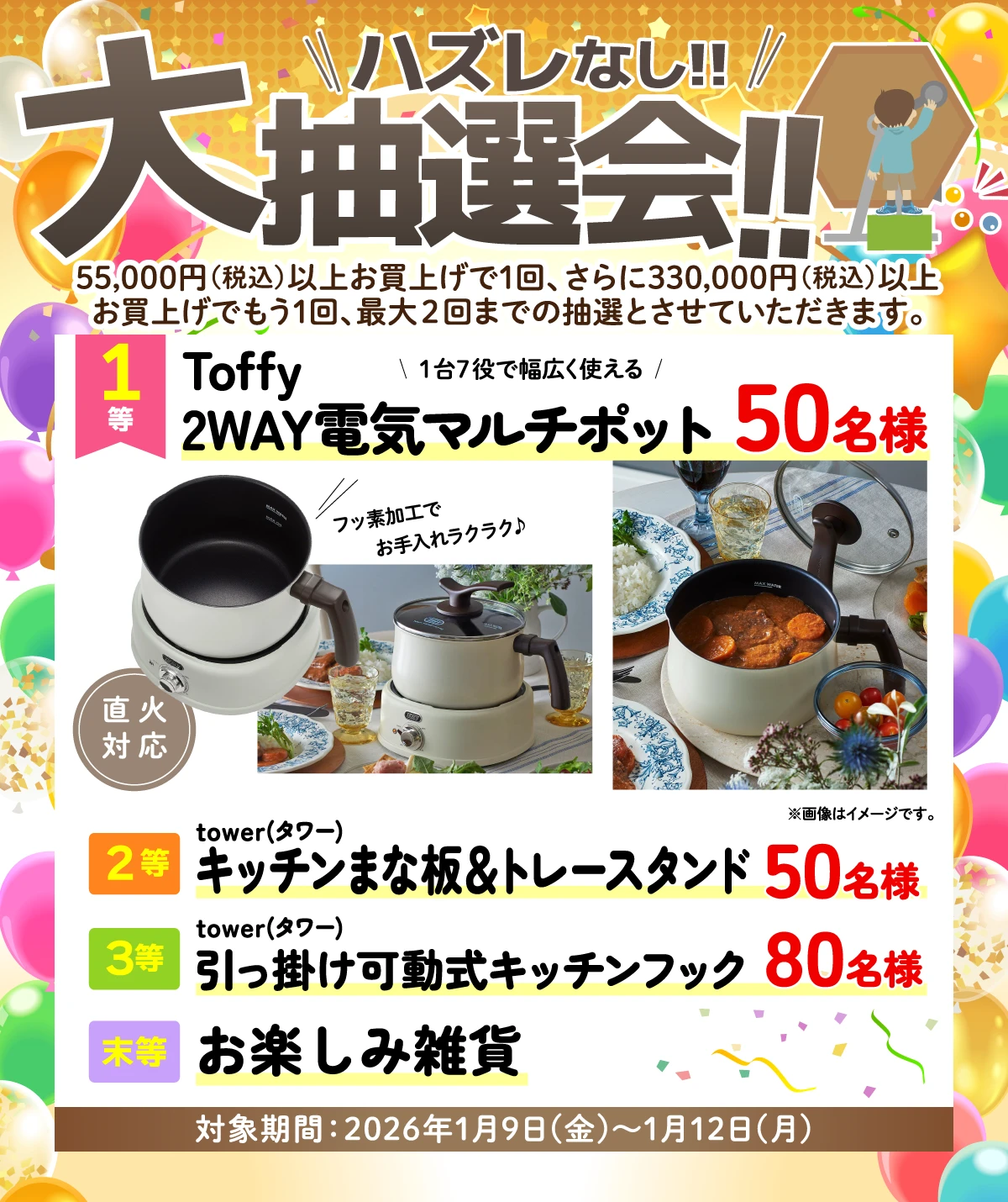 ハズレなしの大抽選会!!(55,000円(税込)以上お買上げで1回、さらに330,000円(税込)以上お買上げでもう1回、最大2回までの抽選とさせていただきます。)