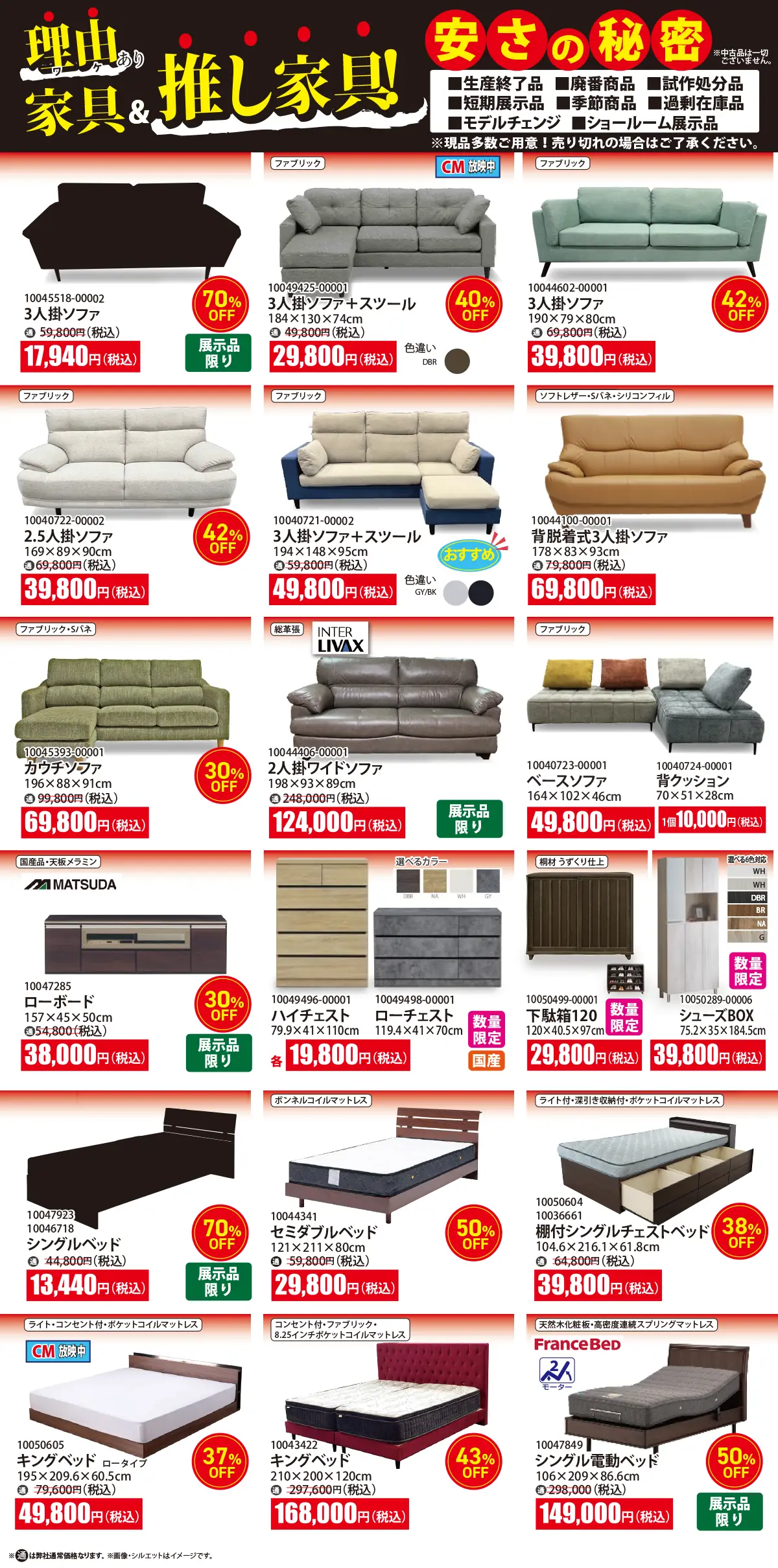 製造中のキズ、セットはずれ、配送中のキズ、試作処分品、展示現品処分品など様々な理由あり品をアウトレットコーナーに大集合。有名ブランド家具・一品もの・掘り出しもの、盛り沢山でお得!早い者勝ちです。