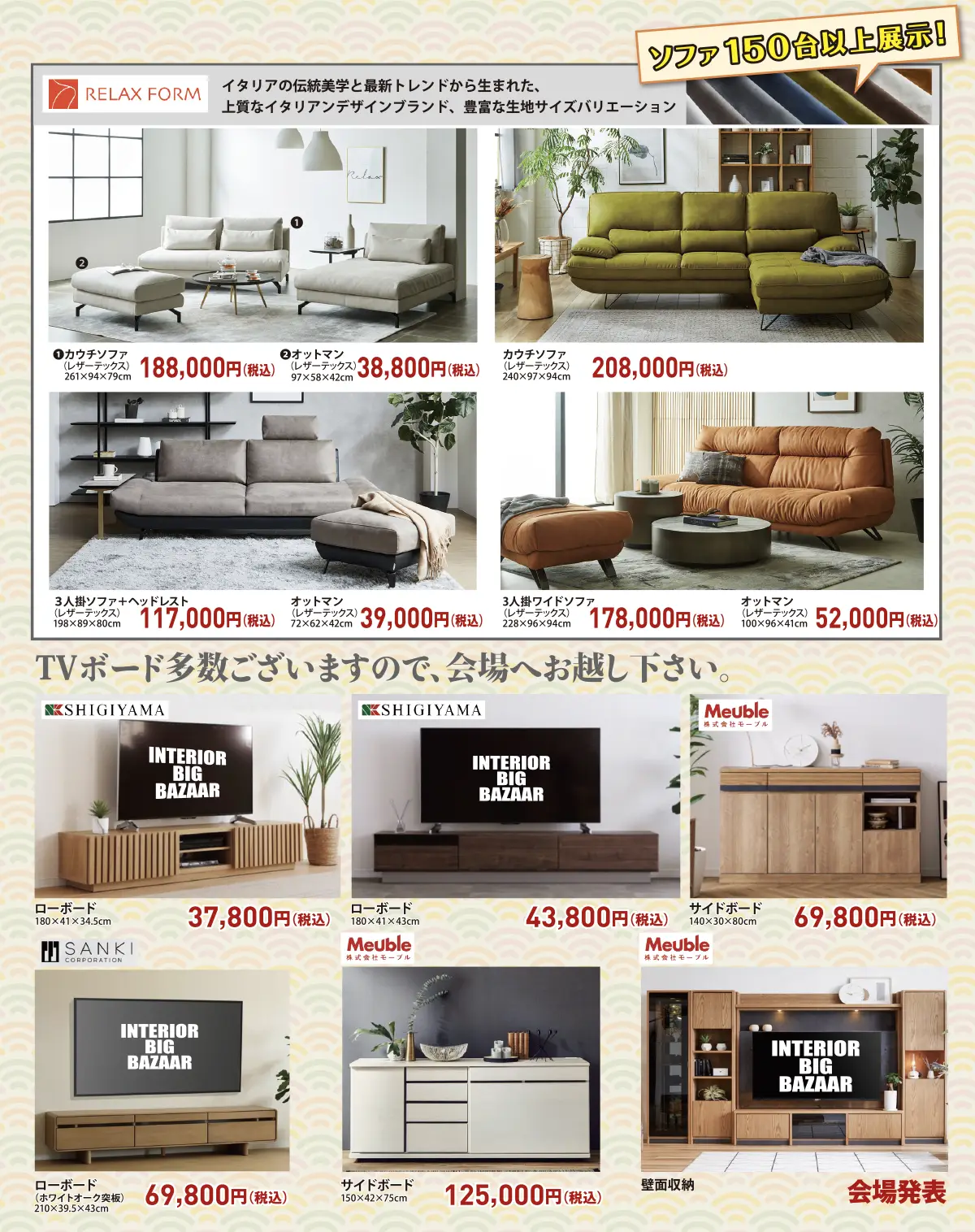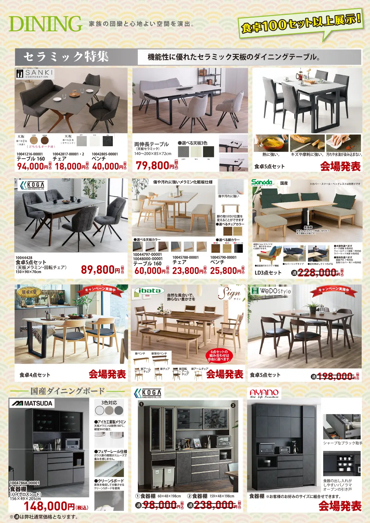 リビング、ダイニングとトータルコーディネートができる全ての家具が揃いました。あなただけのセレクトをお楽しみください。また、会場発表の特別価格の家具もご用意してございますので、あなたにピッタリの家具が見つかります。