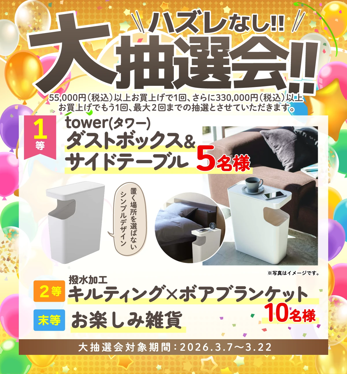 ハズレなしの大抽選会!!(55,000円(税込)以上お買上げで1回、さらに330,000円(税込)以上お買上げでもう1回、最大2回までの抽選とさせていただきます。)