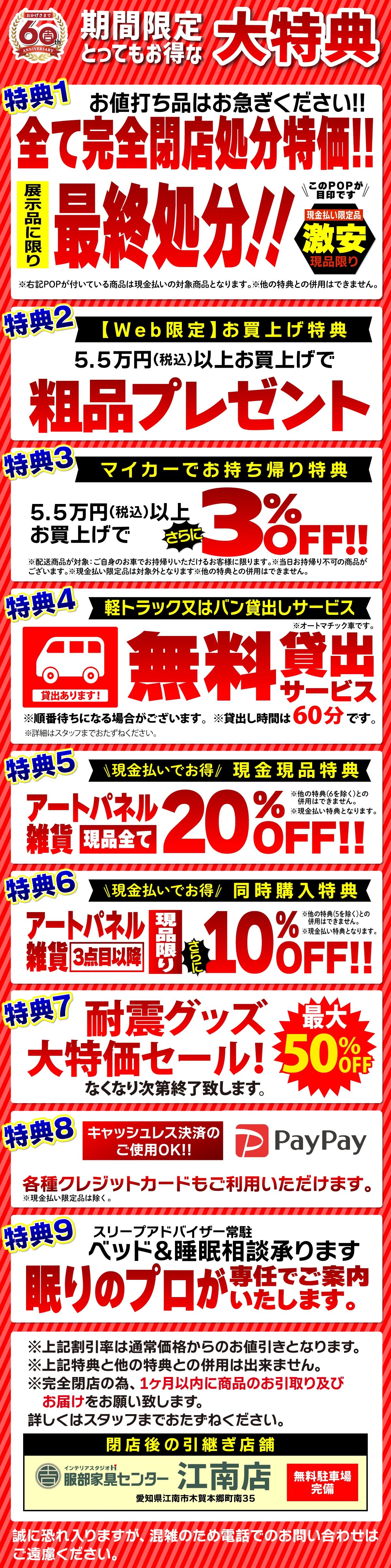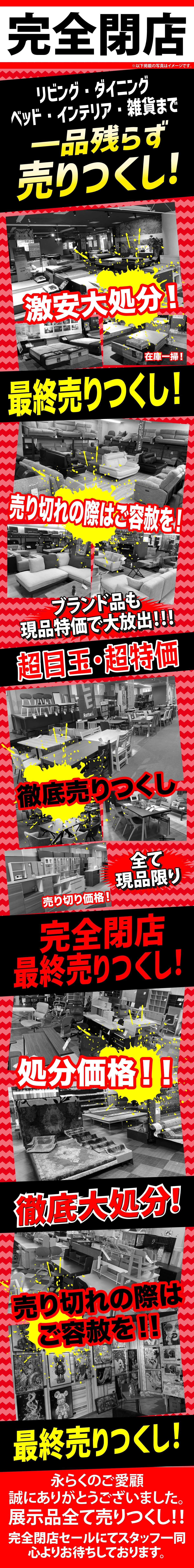 ※上記割引率は弊社通常価格からのお値引きとなります。※上記特典と他の特典との併用はできません。※完全閉店の為、1ヶ月以内に商品のお引取り及びお届けをお願いいたします。詳しくはスタッフまでおたずねください。