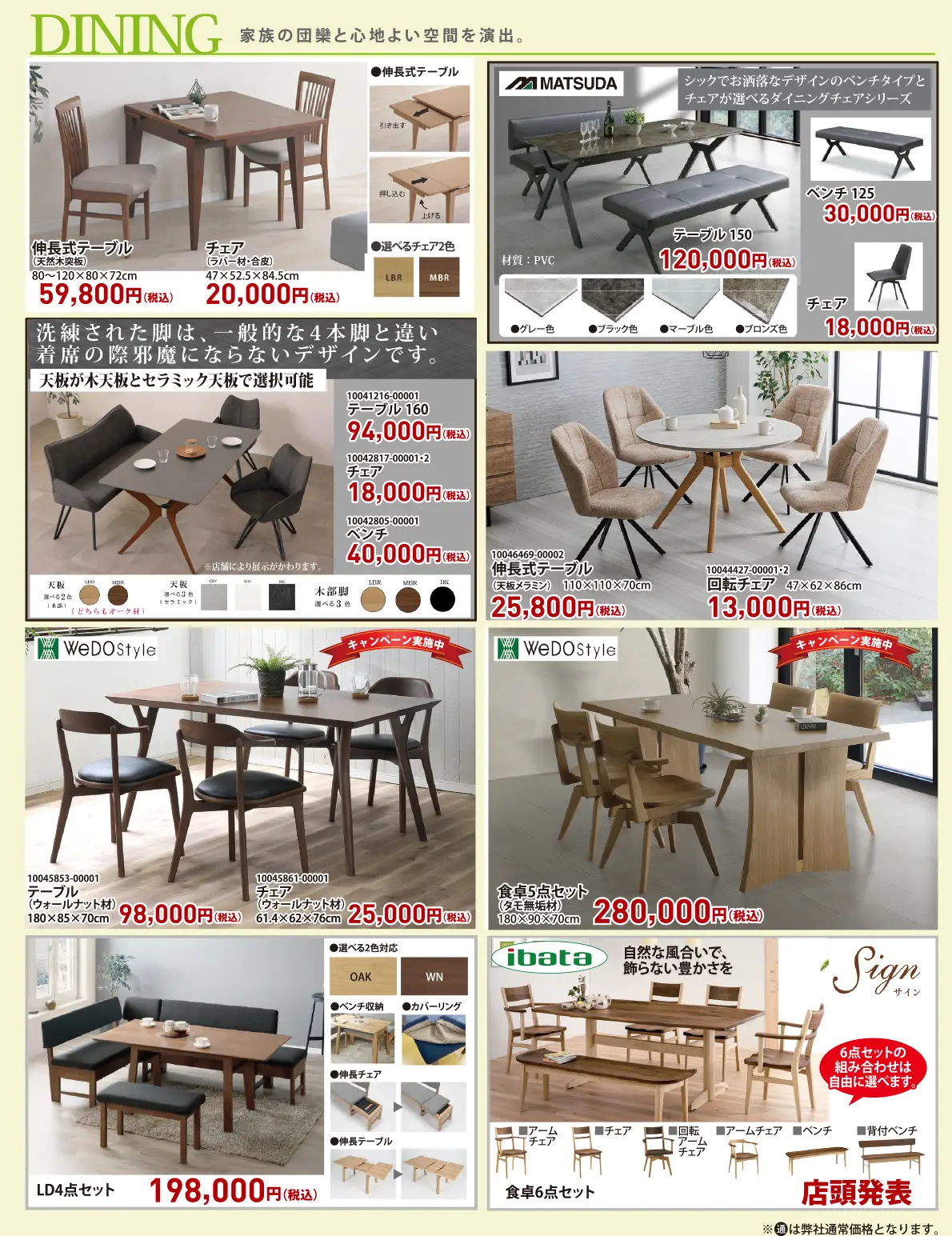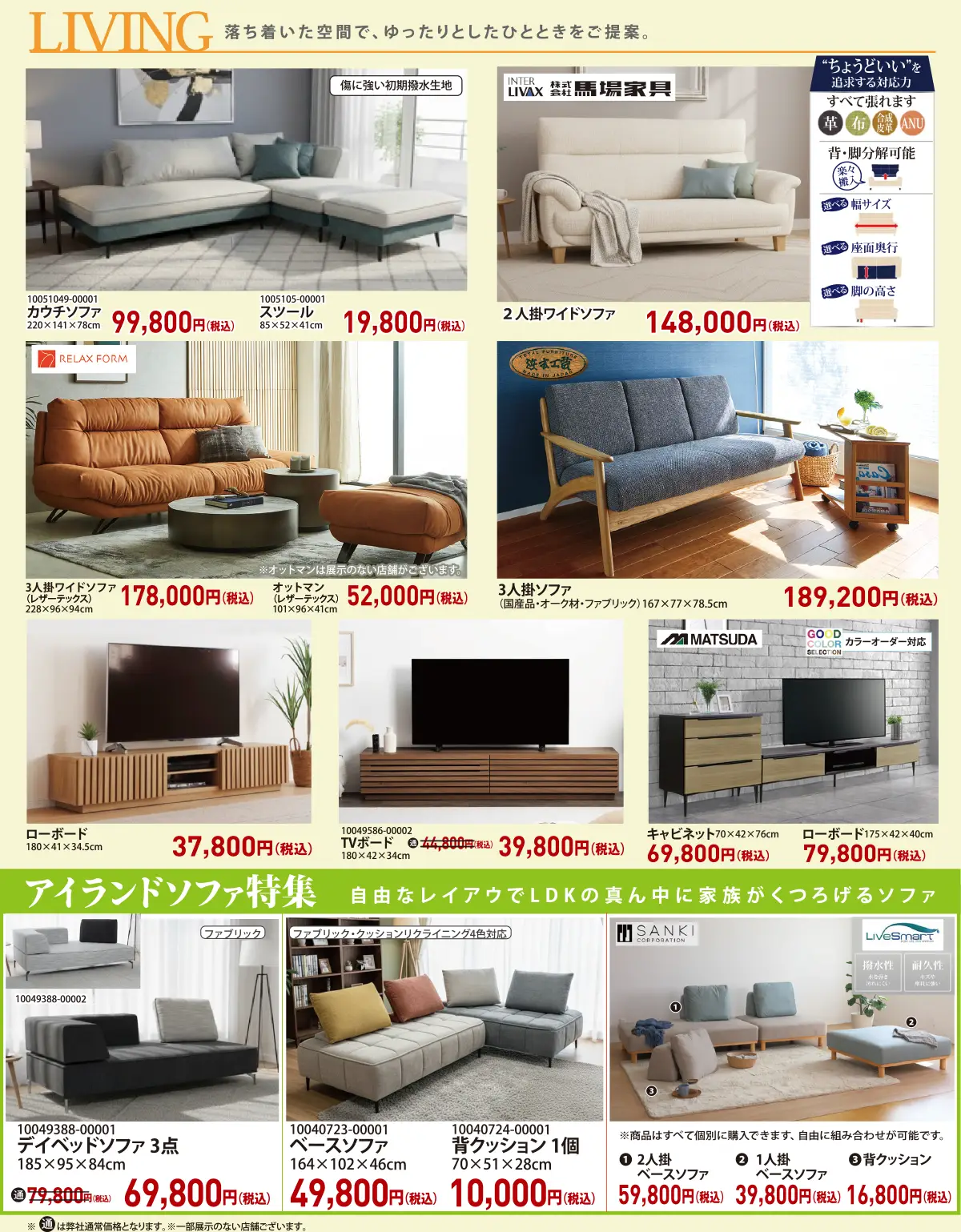 リビング、ダイニング、寝室とトータルコーディネートができる全ての家具が揃いました。あなただけのセレクトをお楽しみください。また、会場発表の特別価格の家具もご用意してございますので、あなたにピッタリの家具が見つかります。