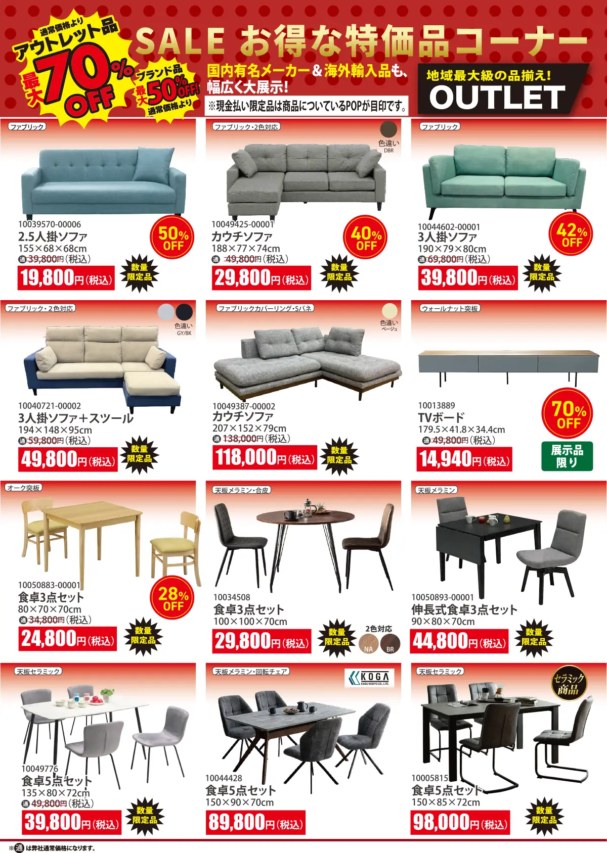 激安アウトレット家具を地域最大級の品揃えで大放出いたします。