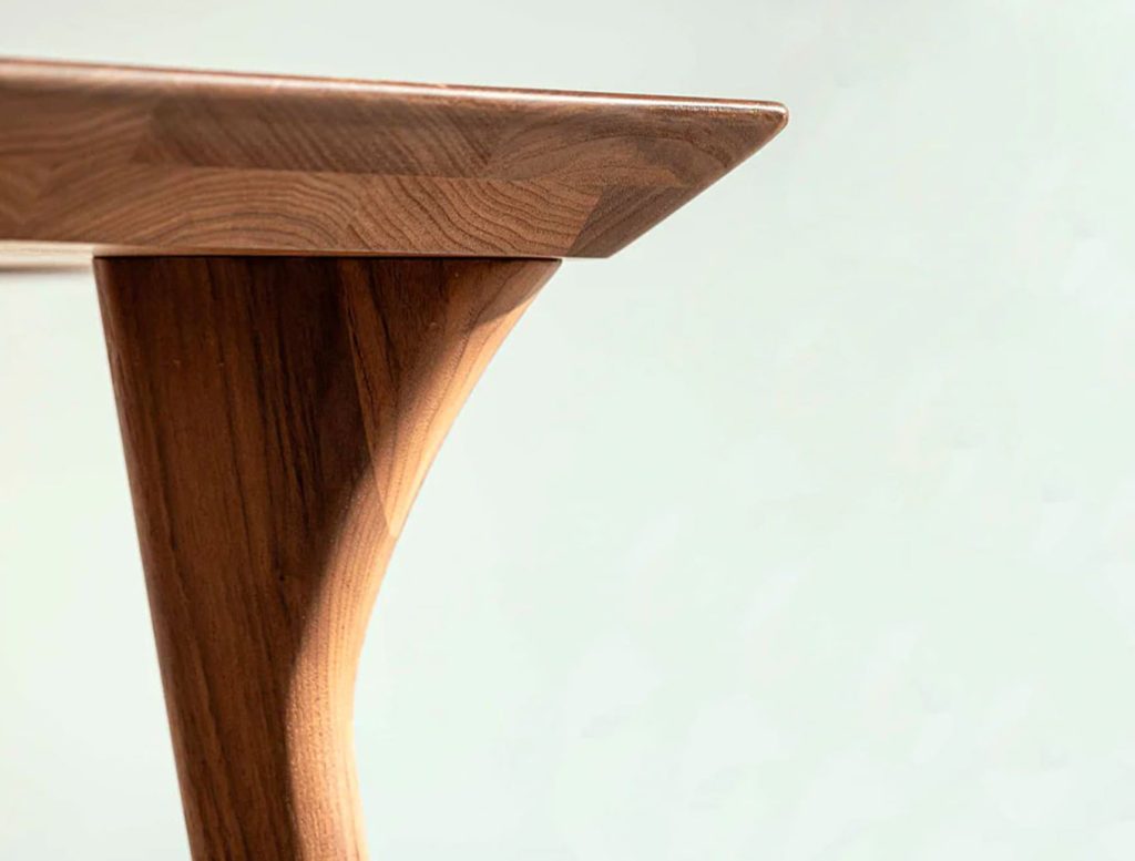 天板のエッジの角度の流れに合わせて脚部のラインも内側に入り流れるように外へと脚が伸びる。