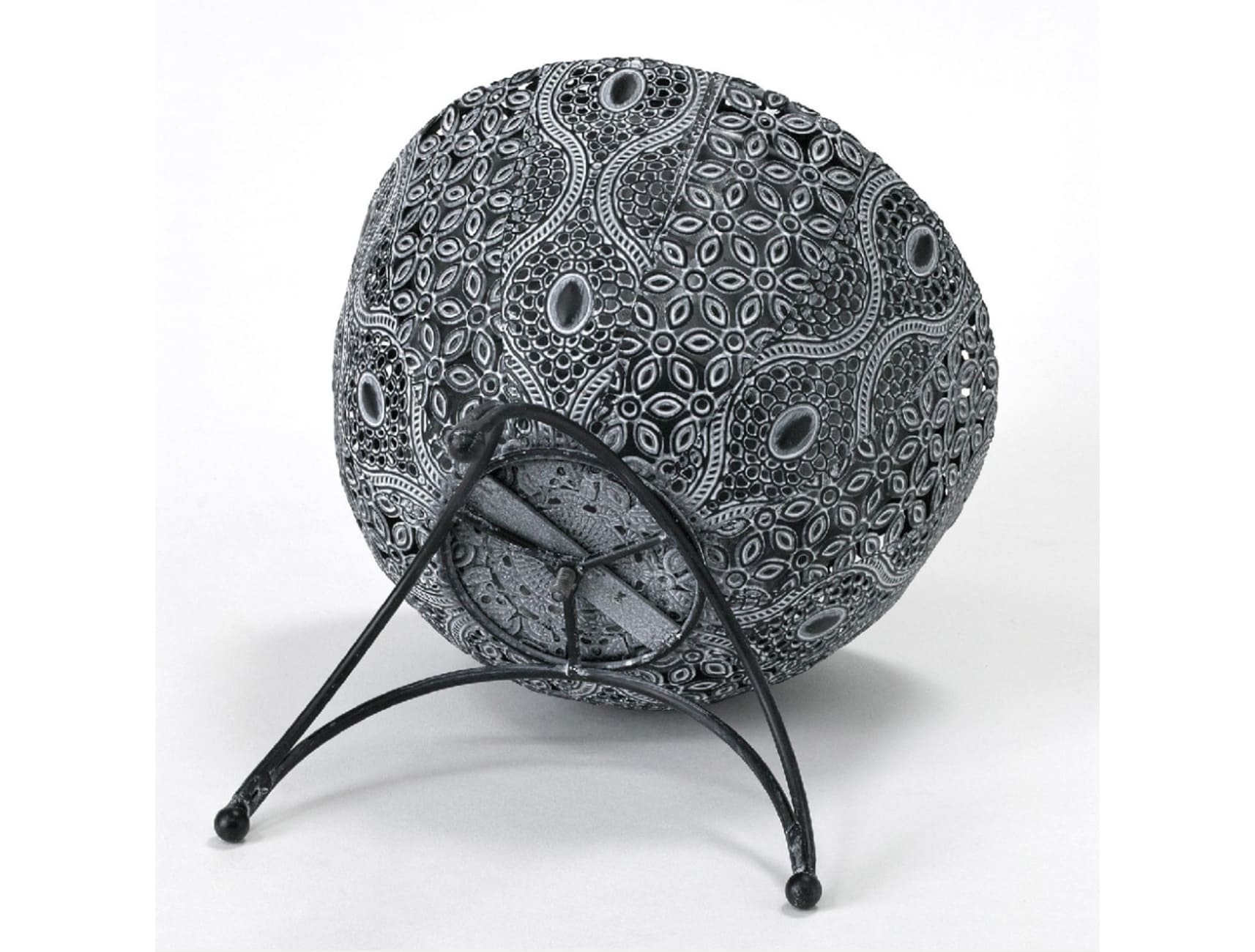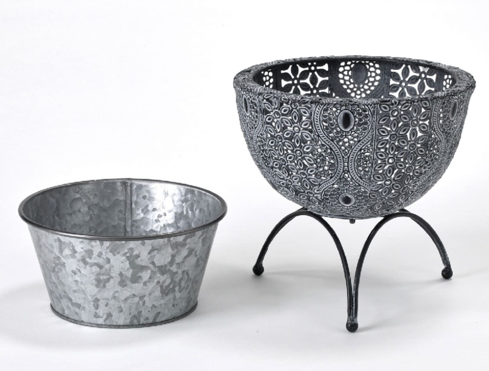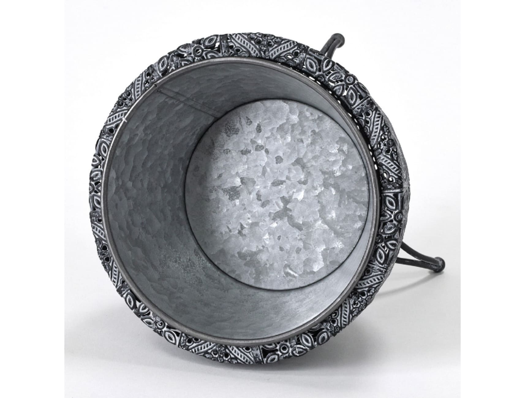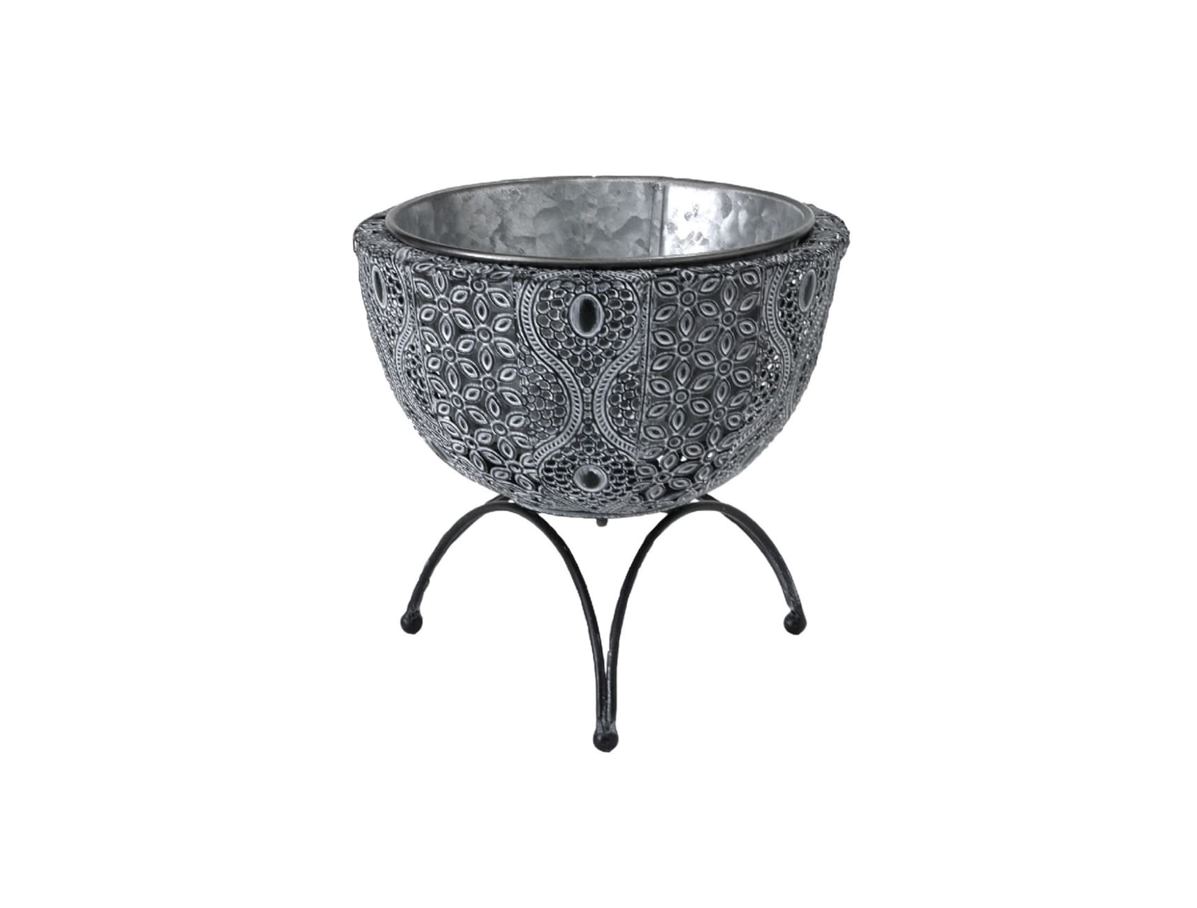 本体部分に透かし彫りでアラベスク風の模様を表現し、アーチ型の脚をつけたアイアン製ポットです。