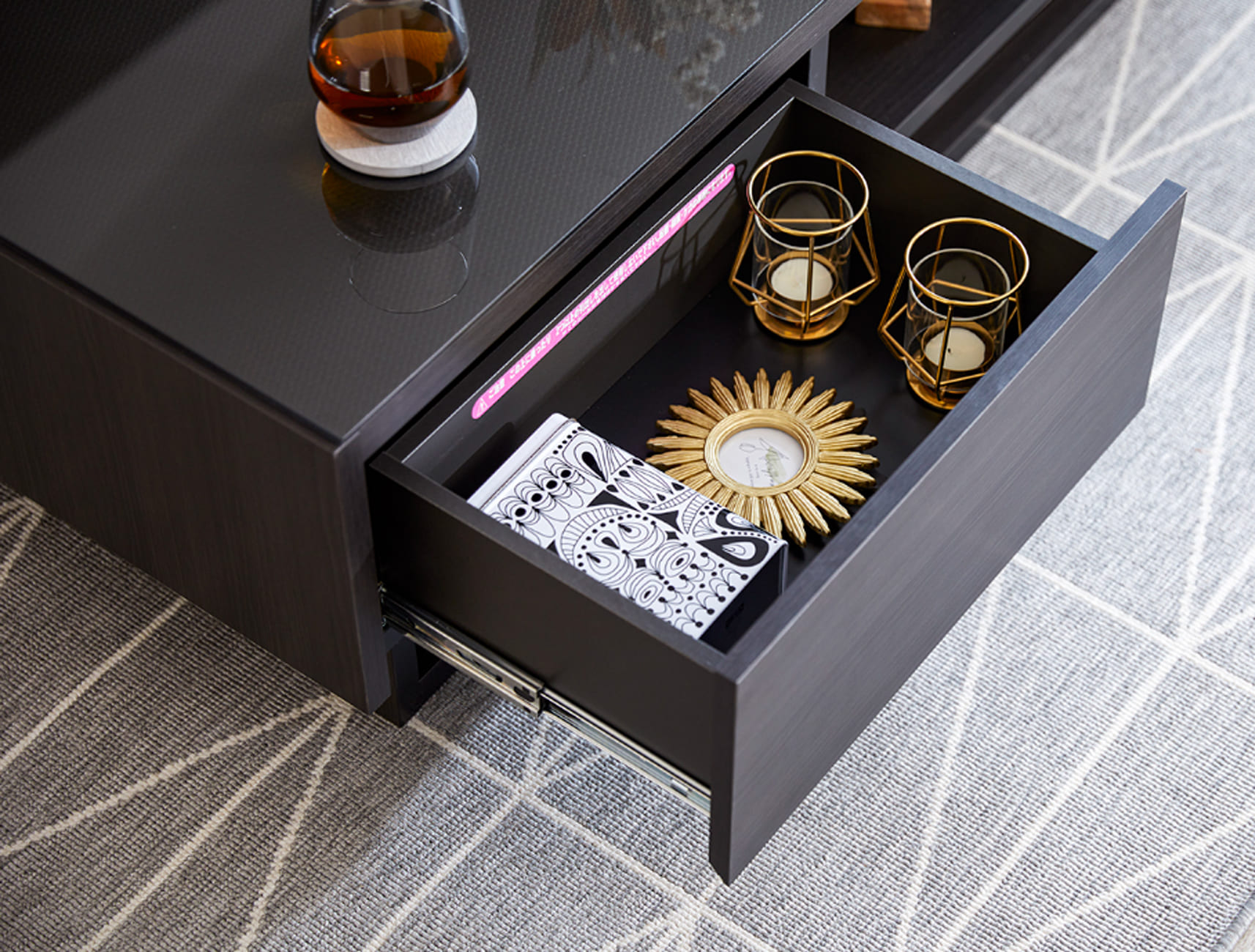 部屋の中心で煌めくたっぷり収納リビングテーブル