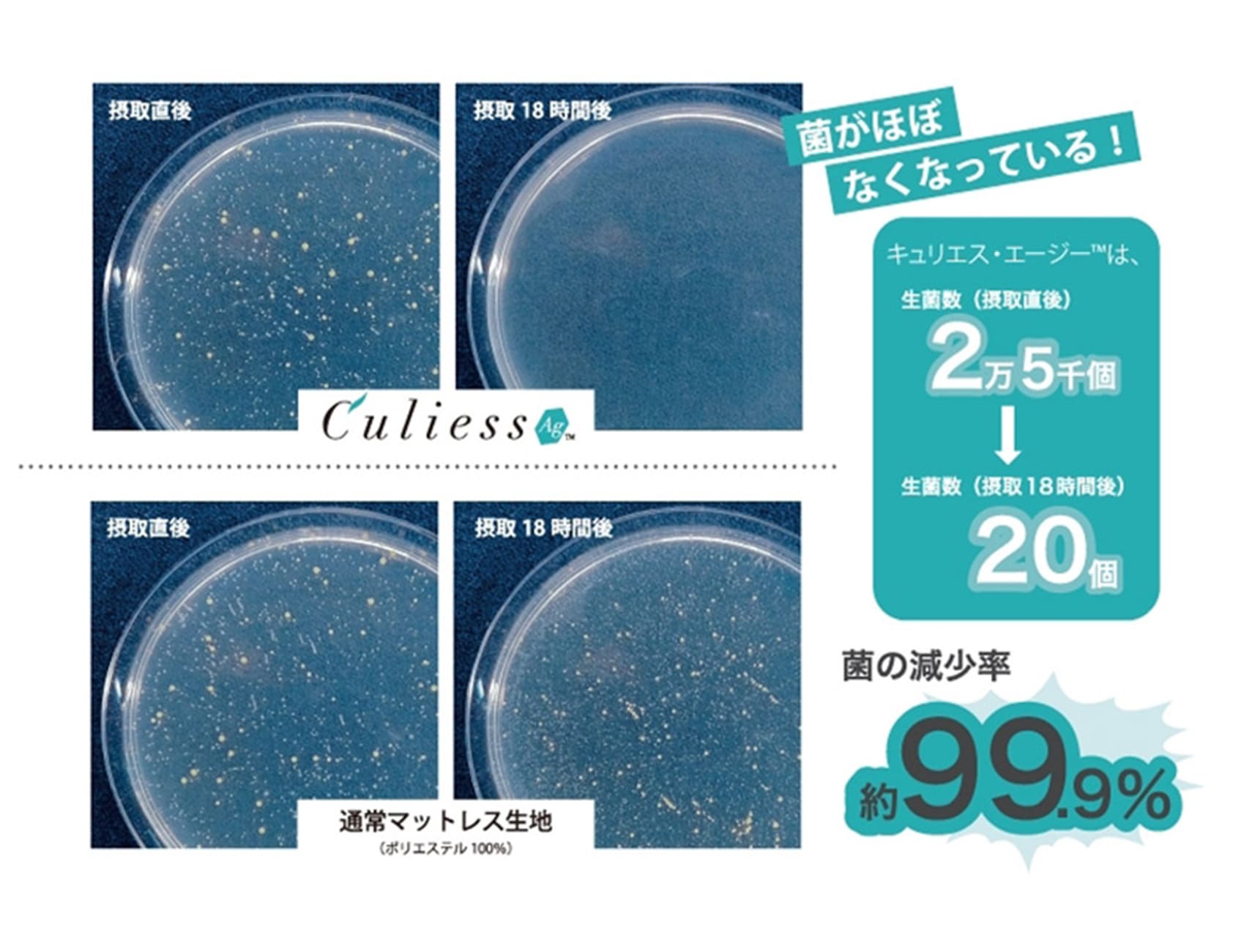 3次元スプリング構造体の新素材ブレスエアーエクストラ®搭載。抜群の通気性、高い耐久性、ふとん乾燥機(低温)もOK。高反発クッションで身体をサポートし理想的な寝姿勢を保ちます。また、寝返りしやすいのが特徴です。除菌機能糸「AGliza®」は、時間の経過とともに菌を減少、99.9%除菌します。悪臭などの原因となる菌11種類への効果があり、高温多湿な日本の寝具の衛生面をサポートします。気になる寝室の臭いに効果的です。