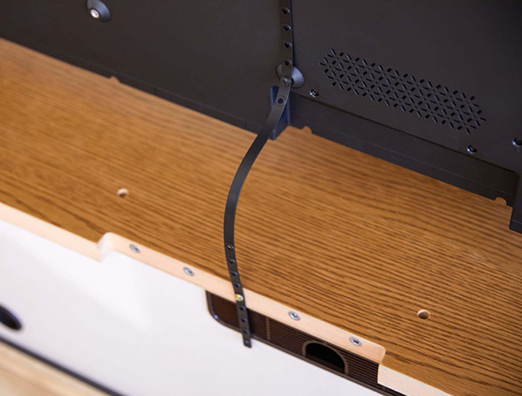 天板の裏側に一部テレビに付属している転倒抑制バンドを取付ける専用のネジ穴を設けています。※バンドは付属していません。