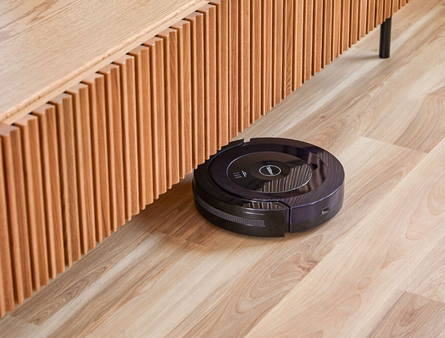 本体の外側に飛び出したスチール脚は、デザインアクセントでもあり、縦格子のラインを引き立てています。 脚高なのでストレスなくお掃除していただけます。